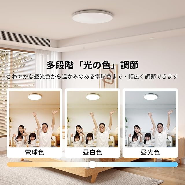 【12段階調光&7段階調色】 ○ 多彩な調整機能:リモコンを使って、12段階の明るさ(10%~100%)と7段階の色温度(電球色3000K~昼光色6500K)を自由に調節できます。勉強や読書時には、クリーンで明るい昼光色に、リラックスしたい時や家族と過ごす時には温かみのある電球色に切り替えることができます。シーンに合わせて色温度を細かく調整でき、リビング、キッチン、寝室、書斎など、あらゆる空間に対応します。 ○ ワンタッチ切替:リモコンや壁スイッチで、3つの色温度(電球色/昼白色/昼光色)を簡単に切り替えることができます。