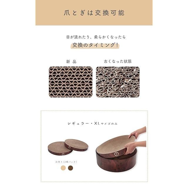 【XLサイズもつめとぎ部分は交換可能】バリバリボウルの特徴であるつめとぎ部分のみの交換、XLでも可能です。 交換用つめとぎとして販売しています(別売り)。 猫のつめとぎは消耗品だからこそ、長く使っていいただけるよう、工夫しています。