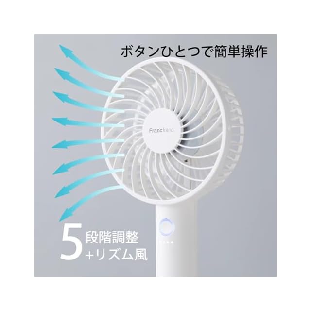 【強力な5段階の風+リズム風】風量は弱~強モードの5段階+リズム風をボタンひとつで簡単に調節できます。手軽な携帯型ながらしっかりと涼しさを感じられるパワフルタイプ。強力な風で熱中症対策にも効果的です。