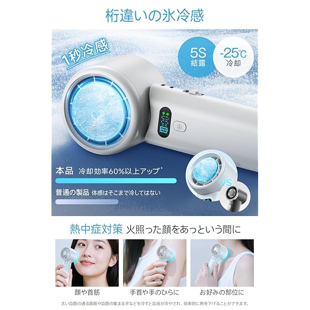 【-25℃瞬間冷却・1秒氷感!熱中症対策バッチリ】冷却プレート付き扇風機です。冷却モードに切り替えて、プレート部を火照った肌に当てれば、まるで氷のようにひんやり冷たい感触が実感できる冷感扇風機。ただの風では物足りない猛暑日に、体感温度を一瞬で下げられるため、熱中症対策に最適。通勤通学、街歩き、スポーツ観戦、花火大会、お祭り、野外イベント、夏フェス、ライブ、キャンプ、旅行などに適用、真夏を乗り越えるお供にぴったりなハンディクーラーです。