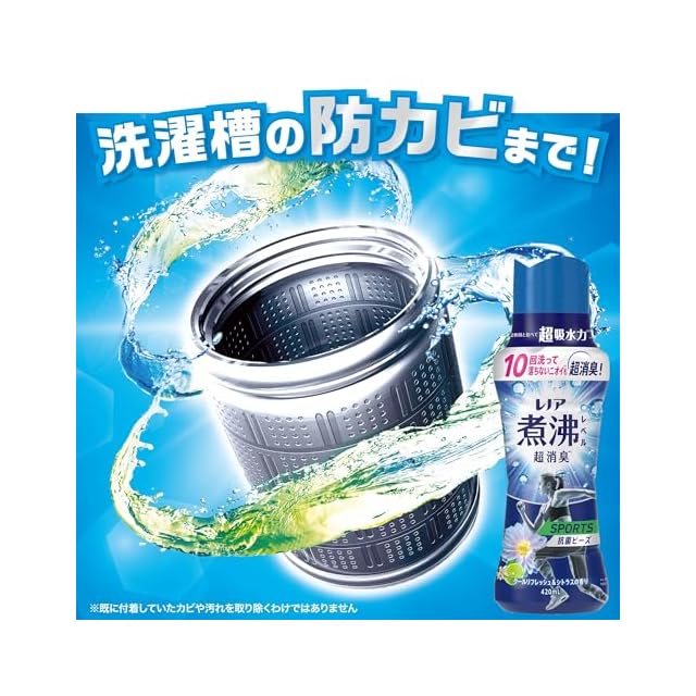 抗菌ビーズは、衣類の消臭専用のお洗濯ビーズ。いつもの洗剤や柔軟剤に加えるだけで、しみついたニオイまで煮沸レベルに消臭* (*洗濯後・部屋干しにて検証。)