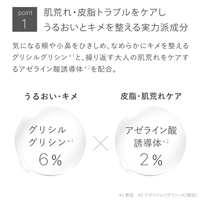 【アゼライン酸誘導体 2%配合】世界で幅広く使われており、穀物に含まれているため刺激が少ない成分であるアゼライン酸の誘導体を2%配合。ザラつき・ごわつきのない、なめらかな肌へ導きます。また、皮脂トラブルもケア。夕方になるとテカリやメイク崩れが気になる方、肌のベタつきが気になる男性の方にもおすすめです。
