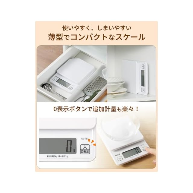 タニタ クッキングスケール 1g単位で1kgまで計れる 収納に便利なフック穴付き ホワイト KD-187 WH キッチン はかり 料理 デジタル
