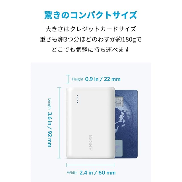 世界最小&最軽量クラス:10000mAh以上のモバイルバッテリーでは、世界最小&最軽量(※2019年5月時点) 。大きさはクレジットカードサイズほどで約180g。いつでもどこでも気軽に持ち運べます。