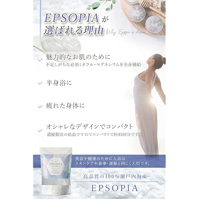 【EPSOPIAが選ばれる理由】魅力的なお肌のために不足しがちな必須ミネラル・まぐねしうむを全身補給半身浴にもオススメです。マグネシウムの温浴で汗とともに・・・疲れた身体に入浴後は心身を和らげぐっすり睡眠が期待できます。オシャレなデザイン濃縮製法の結晶ですのでコンパクトで約45回分です。美容や健康のために入浴はスキンケアや食事・運動と同じく大切です。