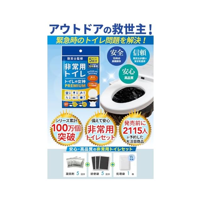 どこでも簡単トイレ トイレの女神PREMIUM 携帯トイレ 簡易トイレ 【防災士が監修】 15年保存&日本製 携帯トイレ 防災トイレ 非常用トイレ 防災グッズ 防災ガイドブック付き (5回)
