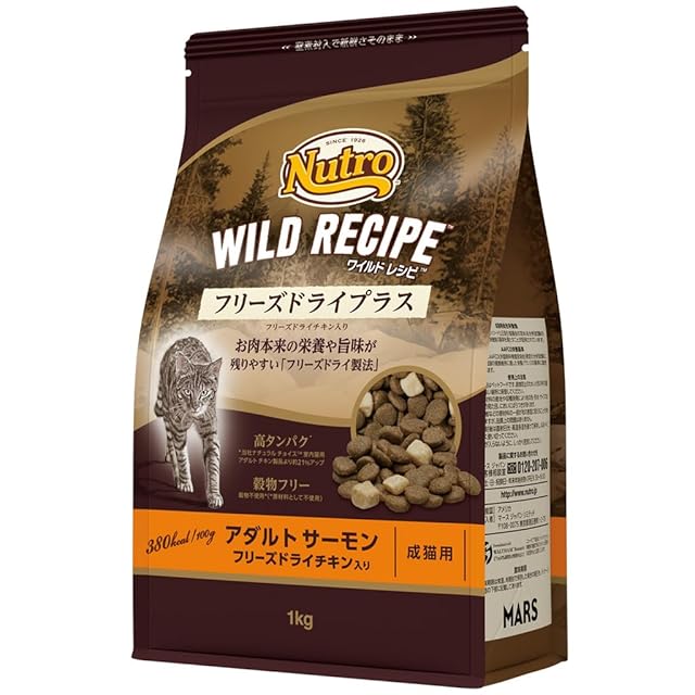 Nutro ワイルドレシピ 成猫用 グレインフリー フリーズドライプラス サーモン 1kg ドライフード 総合栄養食 アダルト キャットフード 猫 穀物フリー 高タンパク 厳選自然素材 香料・着色料 無添加 ニュートロ