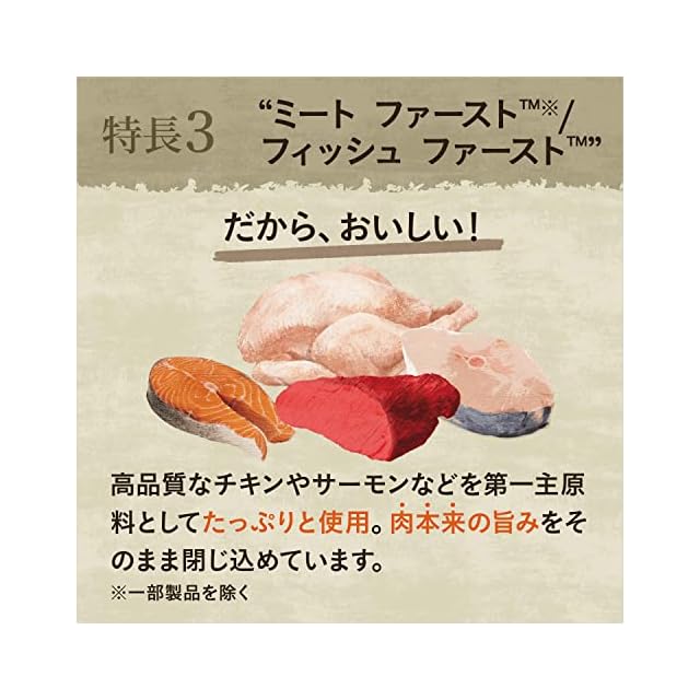 高品質なチキンやサーモンなどを第一主原料としてたっぷりと使用。肉本来の旨みをそのまま閉じ込めています。
