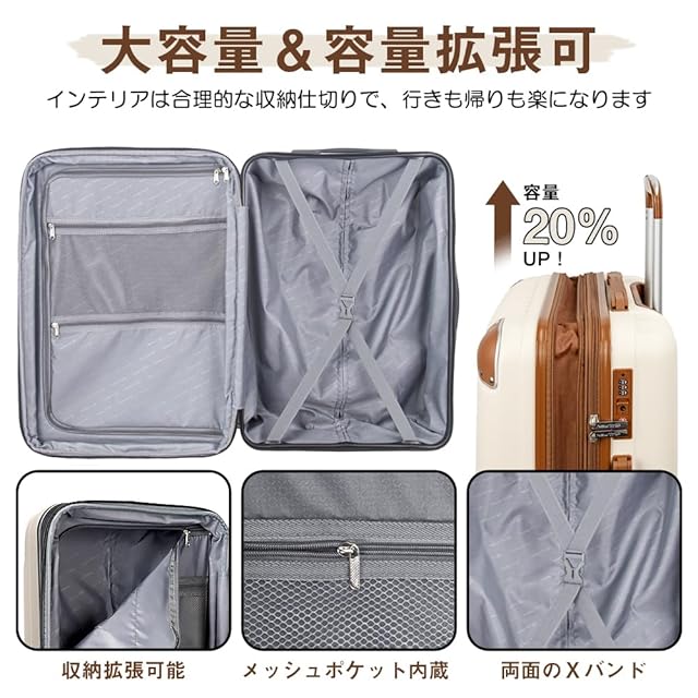【拡張可能・大容量タイプ】 マチ幅を5cm拡張するだけで容量が20%UPできる、大容量スーツケース。土産や、冬場の衣類などで荷物が増えることも考慮して、こちらのキャリーケースを選ぶと、ゆとりが持てるのでおすすめです。さらに視認性の高いメッシュポケット内蔵、メイン収納は合計4か所で、どこに何を入れたかがひと目でわかり、取り出し作業がスムーズになります。大容量で収納便利、初心者から旅慣れた方まで幅広くご利用頂けるスーツケースです。※拡張時は機内持ち込み不可。