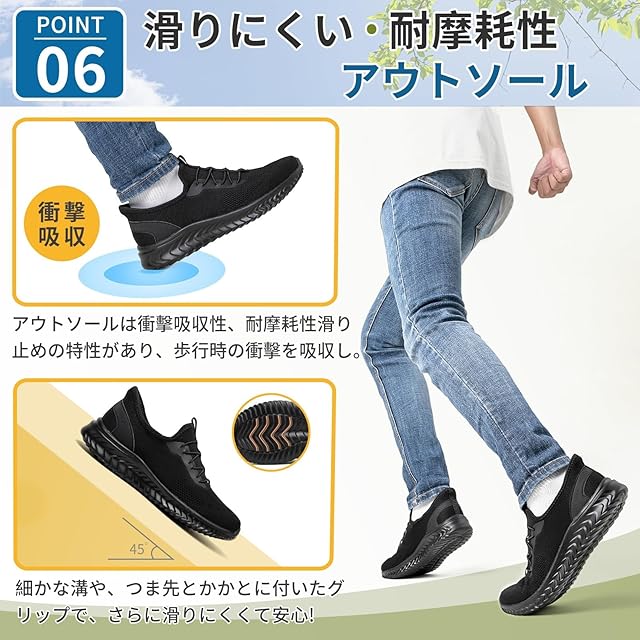立ち仕事靴 軽い:片足わずか約186gの超軽量設計で、まるで靴を履いていないかのような軽さです。EVA素材を使用したソールはクッション性に優れ、長時間歩いても足への負担を軽減します。立ち仕事や通勤、長時間の移動など、足を酷使するシーンでも、負担を感じさせない快適さが特徴です。軽くて疲れにくいので、毎日快適に過ごせます。