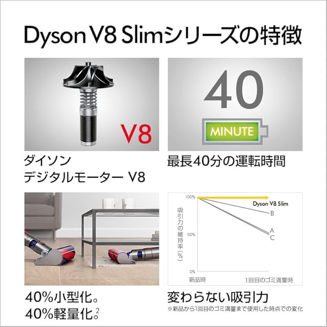 Dyson(ダイソン) コードレス掃除機 Dyson V8 Slim Fluffy スティック ハンディクリーナー サイクロン (SV10K EXT BK) 【より小さく。より軽く。性能はそのままに。】