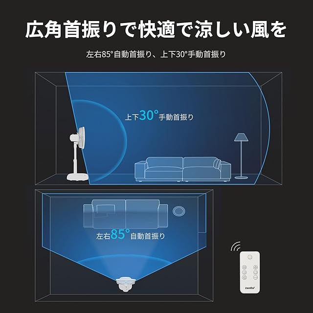【広角自動首振り】左右に85°自動で首振り、上下に30°手動で調整できます。 7枚の羽根により送風範囲が広くなり、より繊細で快適な風をお届けします。