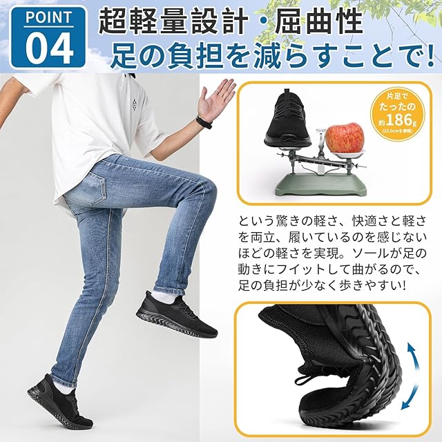 立ち仕事靴 軽い:片足わずか約186gの超軽量設計で、まるで靴を履いていないかのような軽さです。EVA素材を使用したソールはクッション性に優れ、長時間歩いても足への負担を軽減します。立ち仕事や通勤、長時間の移動など、足を酷使するシーンでも、負担を感じさせない快適さが特徴です。軽くて疲れにくいので、毎日快適に過ごせます。