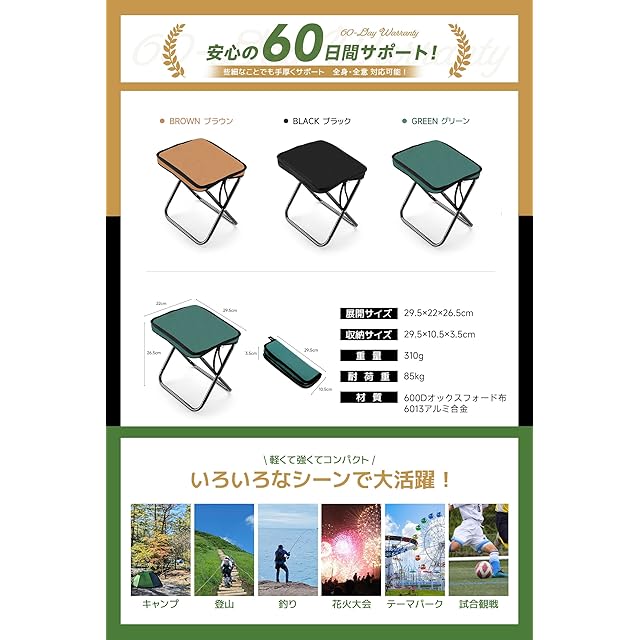 【便利な軽量タイプ】僅か310gの重さは水筒より軽いです。フレーム部分は6013アルミ素材でできており、軽いながら耐荷重は85kgに達しています。持ち手も付きますので、持ち運びに楽々、コンパクトで折りたたみ傘のように使えて便利です。