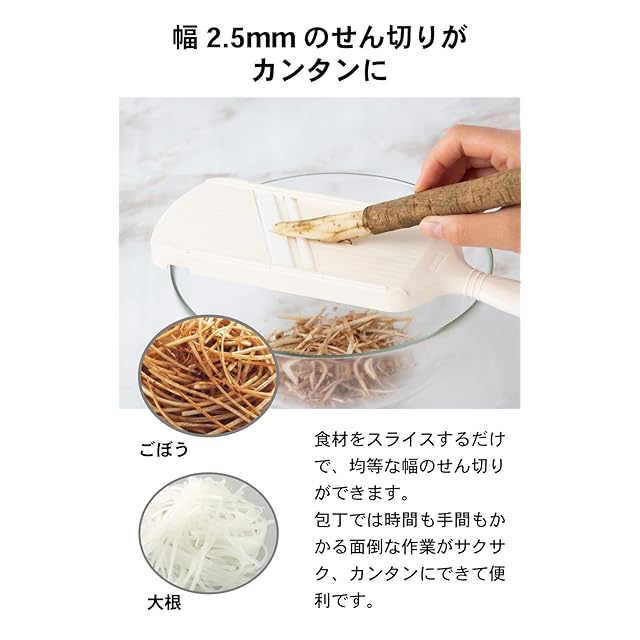 【せん切りが簡単に】幅約2.5mmの櫛刃と鋭い切れ味のセラミック刃で、野菜のせん切りが手早くできる(大根・人参・きゅうり・ゴボウなど)