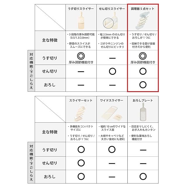 【便利な機能をひとまとめ】セラミック刃だから「軽く、素早く、キレイに切れる」スライサー。薄切り(可変式)・せん切り・おろしプレート・プロテクター(しらがねぎカッター付き)・受け容器(すべり止め付き)を1つに収納