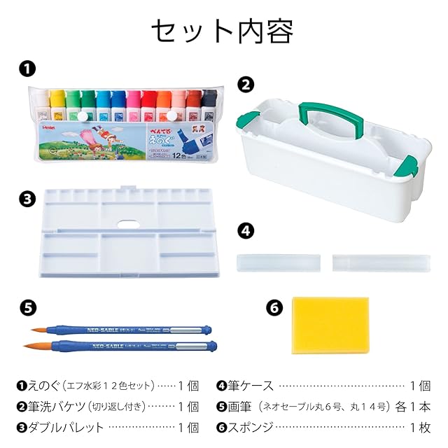【セット内容】エフ水彩12色、画筆(丸筆2種)、パレット、大型筆洗バケツ、筆ケース、スポンジ