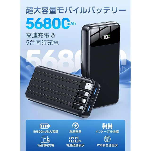 モバイルバッテリー 大容量 56800mAh 【4つのケーブル内蔵&五台同時充電】 急速充電 2.4A出力対応 LCD残量表示 PSE技術基準適合 低電流対応 Type-C入力ポート+2USB-A出力ポート iPad/iPhone/Android全種機器対応 スマホ携帯充電器 安全設計&多種保護 コンパクト 持ち運び便利 旅行/出張/キャンプ/登山/停電対策/緊急防災に 日本語説明書
