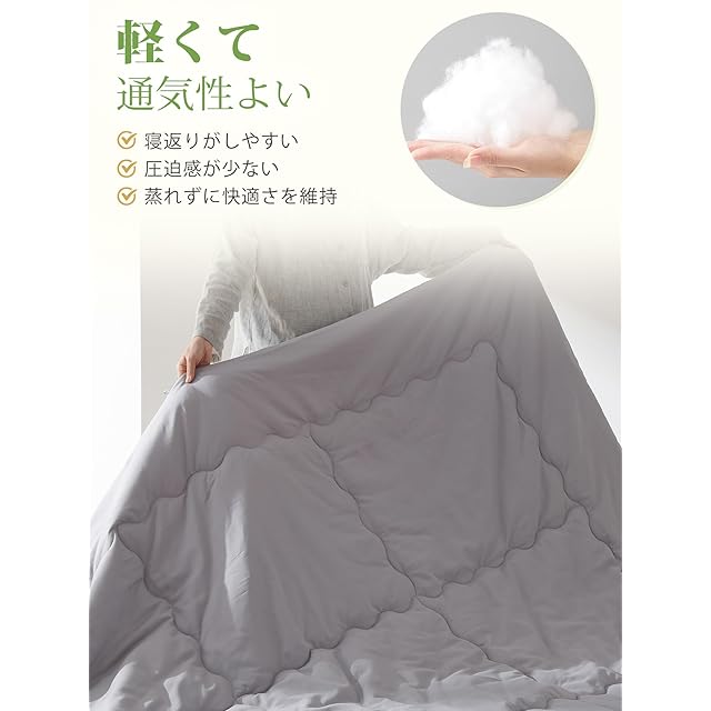 【軽くてふわふわ】わた量を通常の掛け布団の半分ほどにすることで、ふわっと軽くて体への負担を感じさせないです。適度に保温性があり、春から初秋にぴったりのアイテムです。