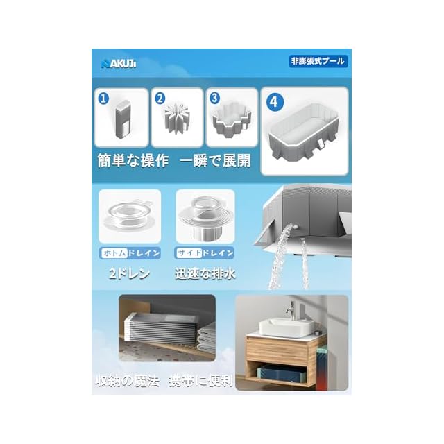 【水漏れ防止・安定した三角構造】プールの側面には厚さ 7 ミリメートルの高強度の 4 層複合材料を使用し、底面には厚みを増した高品質の PVC 材料を採用しています。これにより、優れた耐磨耗性と耐貫通性を備えており、水漏れを防止することができます。従来のインフレータブルプールと比較して、耐用年数は 3 倍以上に延びています。側面には安定した三角形状の支持板を使用しており、プールの圧力と変形に対する抵抗力を強化しています。あなたはお子さんと一緒に楽しく夏の水遊びの時間を過ごすことができます!排水口設計・収納便利】新型のノーインストール折りたたみ式ブラケット付きキッズプールは、耐久性の高い設計だけでなく、使い勝手の良さも十分に考慮されています。側面と底面にそれぞれ排水口が設けられており、排水速度が速く、排水作業も簡単かつ徹底的です。さらに、このプールは従来品に見られる排水不十分や清掃の問題を完全に解決しています。このエアレスプールは簡単に折りたため、コンパクトに収納できます。キャンプや旅行の際に持ち運びに便利で、自宅での収納スペースも節約できます。