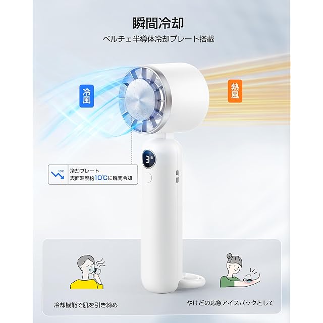 【2025新登場 瞬間冷却ハンディファン】ペルチェ式の冷却プレートを備えた小型扇風機で、ボタンを長押しすると、冷却プレートがわずか数秒で約10℃まで冷却されます。首の大きく太い血管に近づけることで、迅速に体を冷やし、送風によって真夏の暑い日でも涼しさと清涼感を提供します。