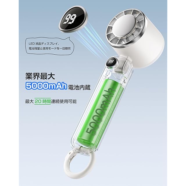 【携帯扇風機史上最長使用時間&5000mAh電池容量】一般的な手持ち扇風機は2000~3000mAhの電池を搭載し、最長で10時間しか連続使用できません。一方、HAGOOGIの新型携帯扇風機は5000mAhの大容量電池を搭載し、弱風モードで最長20時間、中風モードで6~9時間、強風モードで3~6時間の連続使用が可能です。通勤や通学などの移動中だけでなく、一日中デスクワークや野外イベント中も余裕を持って使用できます。LEDディスプレイが搭載されており、バッテリー残量や風量段階が一目でわかり、従来のランプ式よりも細かく電池残量を把握でき、扇風機の充電タイミングもわかりやすくなります。