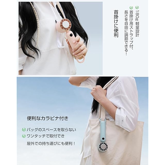【1台多役&携帯便利】4Wayの使い方ができるハンディタイプの携帯扇風機です。①手にフィットするスリムなボディー設計で、握りやすく、手持ち扇風機として長時間使用しても疲れを感じません。②長さを自由に調節できるネックストラップが付いており、ハンズフリーで首にかけて使用でき、作業中や移動中にも便利です。③スタンドとしても使用可能なカラビナが付属しており、卓上での使用もできるため、卓上扇風機としてオフィスや自宅でも便利にお使いいただけます。④冷却プレートを肌に押しあてることで瞬時に肌を冷やすことができるため、ネッククーラーややけどの応急冷却グッズとしても活躍します。軽量かつコンパクトなサイズなので、いつでもどこでも手軽に持ち運ぶことができます。