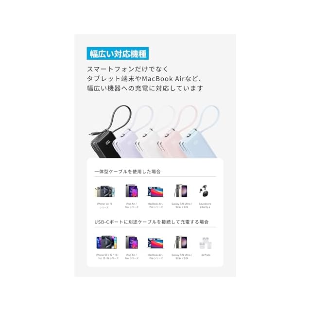 幅広い対応機種 : スマートフォンだけでなくタブレット端末やMacBook Airなど、幅広い機器への充電に対応しています。
