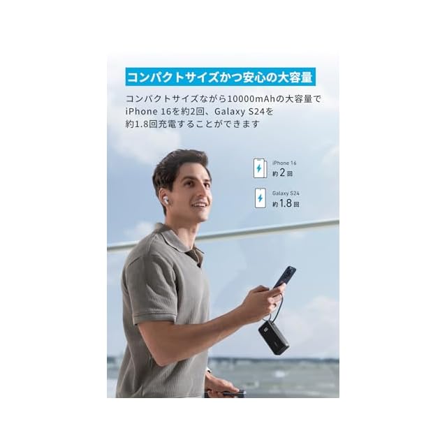 コンパクトサイズかつ安心の大容量:コンパクトサイズながら10000mAhの大容量で、iPhone 16を約2回、Galaxy S24を約1.8回充電することができます。
