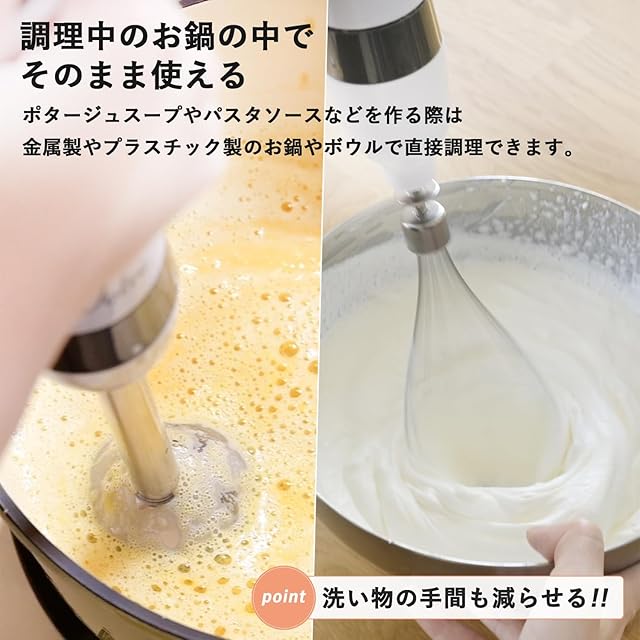 【鍋で直接使える】ポタージュスープやパスタソースなどを作る際は、金属製やプラスチック製のお鍋やボウルで直接調理することができるので洗い物の手間を減らせます。※ガラス製や陶器などの割れやすいもの、袋やシリコン製などの破れやすかったり、やわらかく変形するものは使用しないでください。