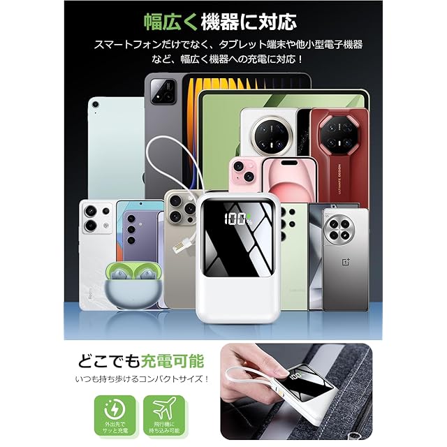 【急速充電可能なポート・4種類ケーブル内蔵】最大2.1Aで急速充電可能USB-A出力ポートを搭載することで、通常の5W出力に比べ2倍以上の速度で充電することができます。USB-A出力ポートと端子の異なる3種類(タイプ-C出力、アイフォン向け出力、micro USB出力)のケーブルが内蔵されており、最大4台のデバイスの同時充電が可能、コンセントのない場所でも手軽に充電できるため、安心して出かけることが可能。畜電可能な充電ケーブル(USB-A入力)を内蔵することで、別途充電ケーブルを持ち運ぶ必要がなく持ち物を少なくし簡単に充電することが可能で、完全なケーブルレスを実現。ケーブルを忘れたときも充電ができないなんて心配はありません。または、本体にケーブルがすっきりと収納できるので、カバンの中でケーブルが絡まったり断線することを防ぎます。