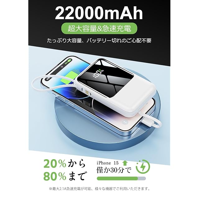 モバイルバッテリー 大容量 22000mAh 【230g軽量化・4つのケーブル内蔵】モバイルバッテリー 軽量 小型 急速充電 4台同時充電 残量ディスプレイ搭載 PSE技術基準適合品 LED照明ライト マルチ安全回路保護 タイプC入力ポート&USB-A出力ポート 4種類ケーブル内蔵 携帯充電器 スマホ充電器 コンパクト&軽量 機内持ち込み可能 旅行/出張/アウトドア/停電/防災緊急用 白い