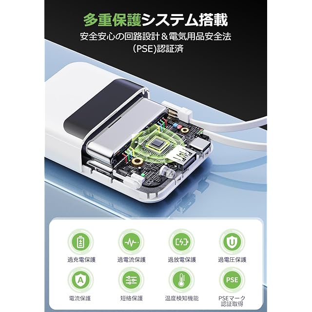 【安全に使える、安心設計】①日本の電気用品安全法(PSE)お技術基準に合格した安全性の高いモバイルバッテリーです。②温度検知センサーによる加熱保護機能を搭載③過電流・短絡・過充電・過放電等の各種保護機能を搭載、過電流・過電圧・短絡(ショート)発生時に出力電流を停止します。④ボディには汚れ・キズを抑える表面加工が施されているほか、高グレードの厳格に試験されたバッテリーと耐久性の高い難燃性筐体ケースを採用しています。火災、衝撃、落下に対して高い耐性を備え、安全性を確保しつつ、熱によるバッテリーの劣化を抑えられます。【防災用LEDライト付】被災時などに光源として利用できるLEDライトも付いているので、アウトドアなどで周囲を照らせるほか、停電や災害等非常時にとても便利で役立ちます。【パッケージ内容】22000mAh モバイルバッテリー+充電用Type-Cケーブル+日本語説明書。