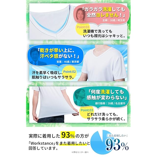 【WORKSTANCE】は抗菌防臭に優れた深めのVネックインナーシャツです。汗を掻いた後の嫌なニオイをシャットダウンし、常にサラサラ状態をキープします。