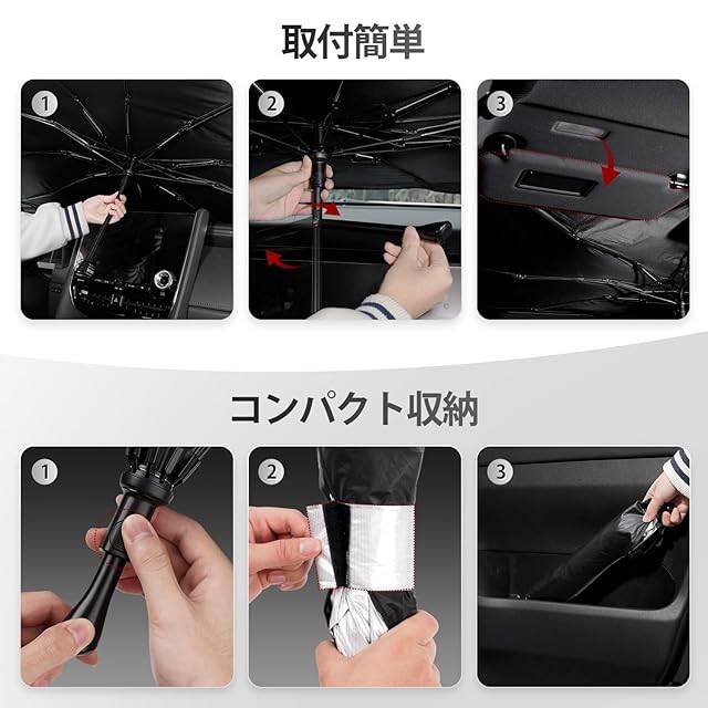3.【2025年新登場 曲げ可能な傘柄】:傘型車用サンシェードは、ユニークなデザインで、数角度を調整することができますので、車の形に合わせて設置できます。従来品のステンレス製ハンドルに比べ、ダッシュボードなどの内装部品を傷から大幅に保護する。また、インナーポールは、柔軟性と強度を併せ持つ、31本の丈夫なガラス繊維ででき、防錆処理により、サンシェードは超タフで錆びにくくなっています。