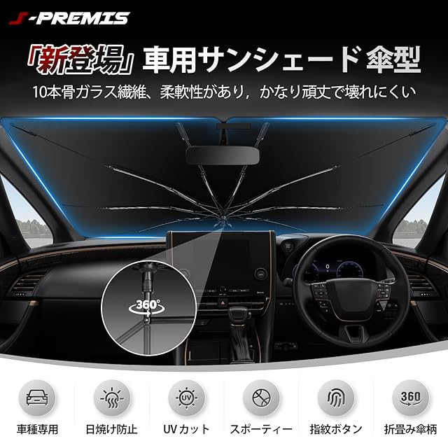 3.【2025年新登場 曲げ可能な傘柄】:傘型車用サンシェードは、ユニークなデザインで、数角度を調整することができますので、車の形に合わせて設置できます。従来品のステンレス製ハンドルに比べ、ダッシュボードなどの内装部品を傷から大幅に保護する。また、インナーポールは、柔軟性と強度を併せ持つ、32本の丈夫なガラス繊維ででき、防錆処理により、サンシェードは超タフで錆びにくくなっています。