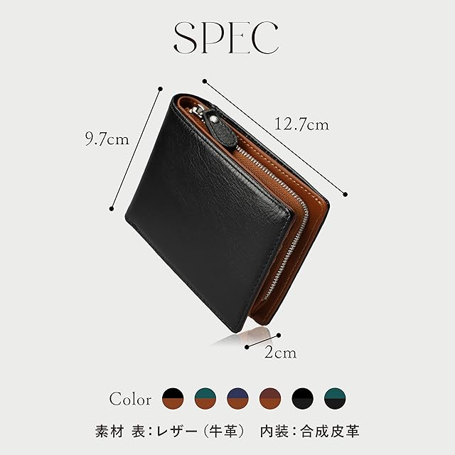 表地:レザー 内装:合成皮革 留め具の種類:ファスナー(小銭入れ)