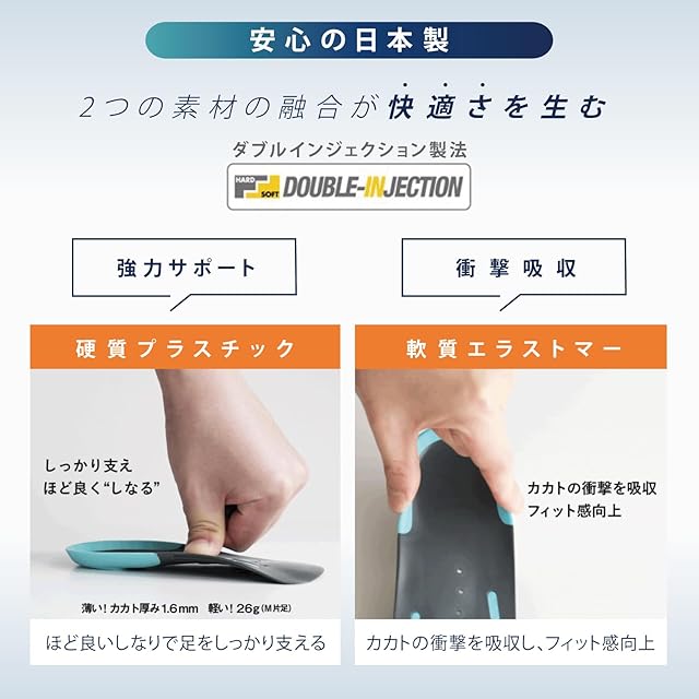 【企画開発】日本の技術を結集して開発した、純日本製のインソールです。イノベーションとも言える最新のダブルインジェクション製法を採用。(日本、米国、欧州特許取得商品)