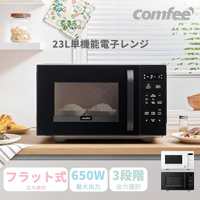 【商品仕様】COMFEE' 23L単機能電子レンジ:◇機能:加熱・解凍・半解凍・消音・チャイルドロック・キッチンタイマー機能付き◇外形寸法:幅496✖奥行400✖高さ303mm、約12.9㎏ ◇庫内寸法:幅306✖奥行347✖高さ204mm◇電源:AC100V、ヘルツフリー ◇出力:200W・500W・650W(65Hzのみ) ◇タイマー:最大89分◇オートメニュー数:13種類※ 製品期間:一年間