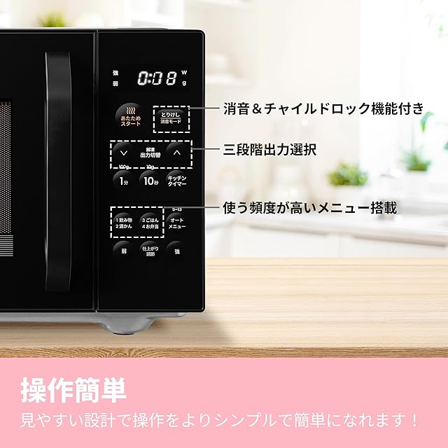 【消音・チャイルドロック・キッチンタイマー機能】子供のいたずら事故を防ぐために、チャイルドロックをかけることができます。また、夜や朝早めに料理をする時、消音モードにすれば騒音を出さずに静かに操作できます。それに、 パンを発酵したり、カレーを作ったりした時、この電子レンジもキッチンタイマーとして使えられ、最大89分カウントダウンできます。