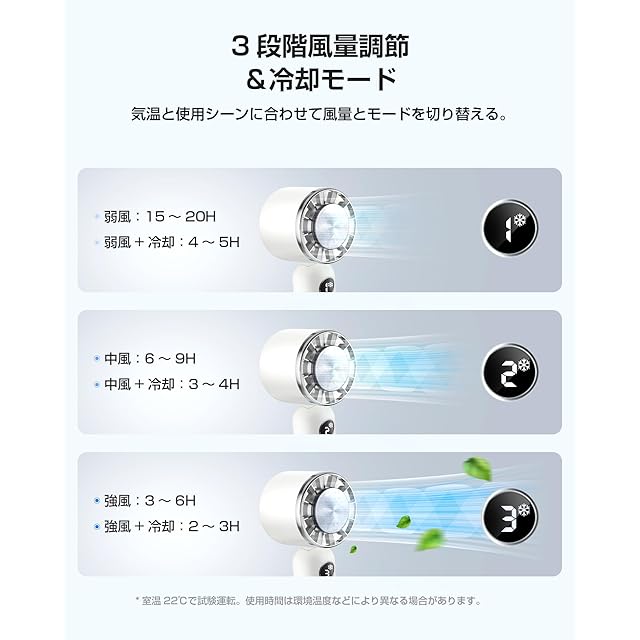 【3段階風量調節&冷却モード&強力送風】弱風、中風、強風の3段階風量調節機能により、気温や使用シーンに合わせて風量を調整できます。冷却モードでは、肌に冷たさを伝え、冷却グッズとしても利用でき、熱中症対策にも最適です。また、空気力学に基づいた小型ファンヘッドには、6枚の羽根が搭載され、風力の効果を増幅し、通常のハンディファンよりも送風効率を向上させます。