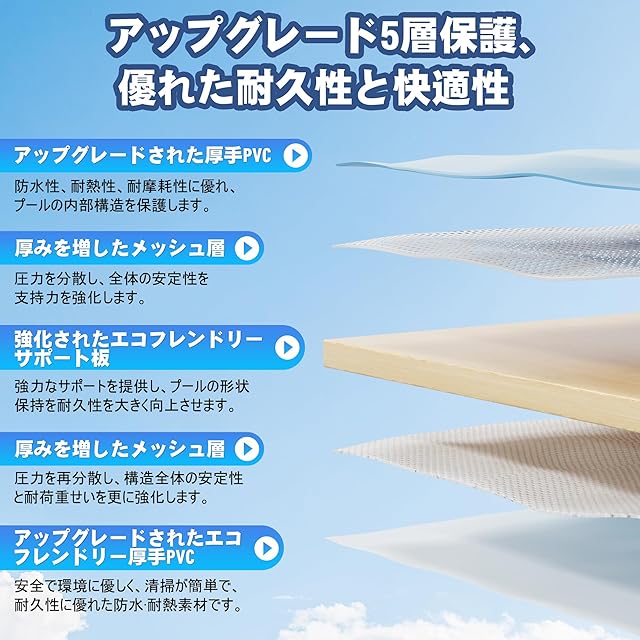 【エア&水漏れ防止】めんどな空気入れする必要がなく、穴が開いて萎んでしまう心配もございません!環境に優しい素材を使用して製造されています。プールの側面も厚く、高強度4層PVC複合材料でできて、プールの耐久性と耐圧性を高め、日々の摩耗や摩擦に耐えるだけでなく、使用中の強い水流による衝撃と水漏れを効果的に防ぎます。プールの底面には多層高品質PVC素材を使用しています。プールの極めて長い耐用年数をします(通常プールの3倍耐用年数)。