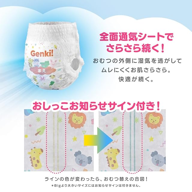 あんしん“Genki!パンツ”。赤ちゃんのデリケートな肌に、いつでもやさしく。ストレスフリーに配慮したやさしいパンツ。ベビーおむつ。