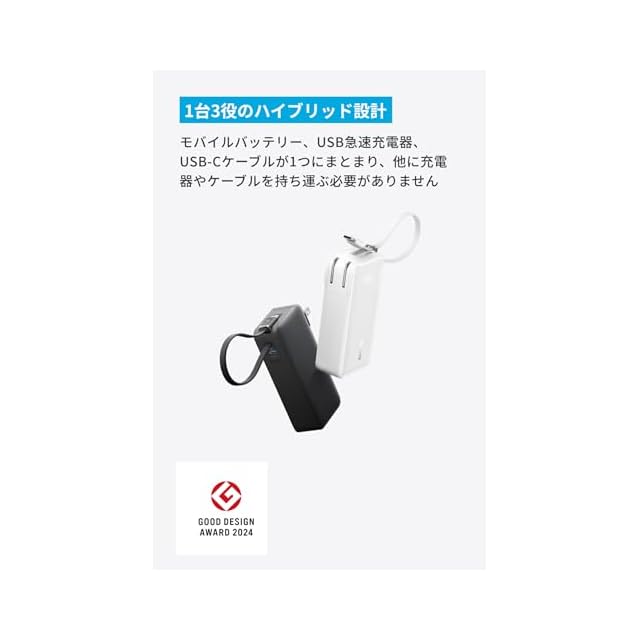 1台3役のハイブリッド設計:モバイルバッテリー、USB急速充電器、USB-Cケーブルが1つにまとまりました。他に充電器やケーブルを持ち運ぶ必要がありません。