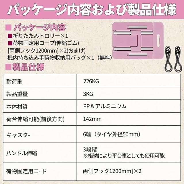 商品名:キャリーカート 台車 コンパクト 折りたたみ台車 折り畳み 耐荷重226kg 固定ラバーストラップと収納バッグ付き キャスター付き 荷物台車 折り畳み 軽量 倉庫移動 車載、出張、引越し、防災などのシーンに最適 家庭用品 桜色(ピンク)