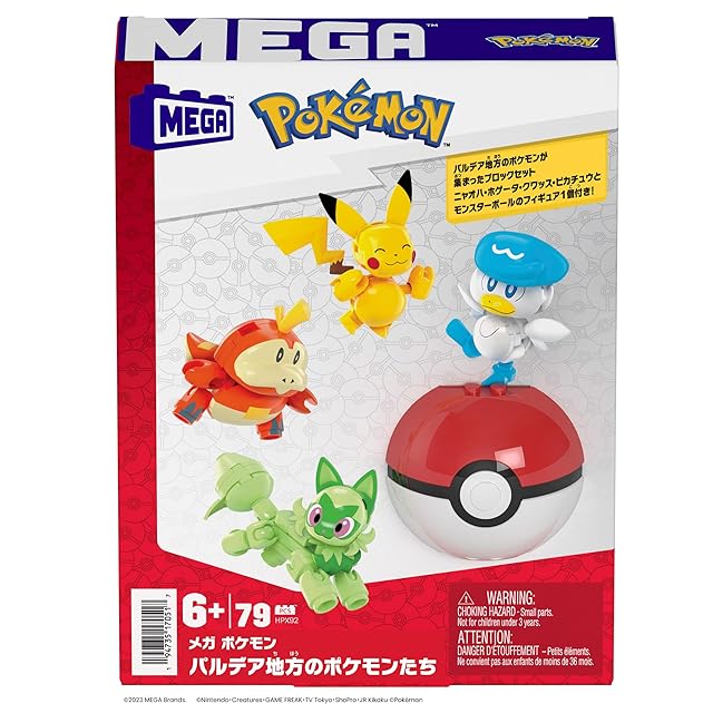 【内容】パルデア地方にいるポケモンが組み立てられるブロックセット。ピカチュウ・ニャオハ・ホゲータ・クワッスのポケモン4種がセットになっています。合計79ピース。ポケモンを組み立てたらお気に入りを決めて、ポケモンバトル!はじめてのごっこ遊びにぴったりのプレイセットです。2023 MEGA Brands. Nintendo・Creatures・GAME FREAK・TV Tokyo・ShoPro・JR Kikaku Pokémon