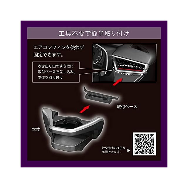 ●工具不要で簡単な取り付け(所要時間の目安:3分) カローラ専用ベースをベース裏面の粘着テープでセンターコンソールに取り付け、専用ベースにスマホホルダーを取り付けます。予備の両面テープも1セット付属しております。 また、専用の設計なので内装にキズが付いたり、取り付け跡が残ったりしない取り付けが可能です。