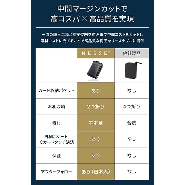 【detail】:お札は2つ折りで収納でき、小銭を取り出しやすいように大きく開きます。カードポケットはクレジットカード入れ × 4 に設定し、外ポケット × 2の構造で交通ICカード(suica nimoca pasmo nicoca)等々を収納したままタッチ通過できる小銭入れ付きパスケースや、とりあえずのレシートを入れにも。