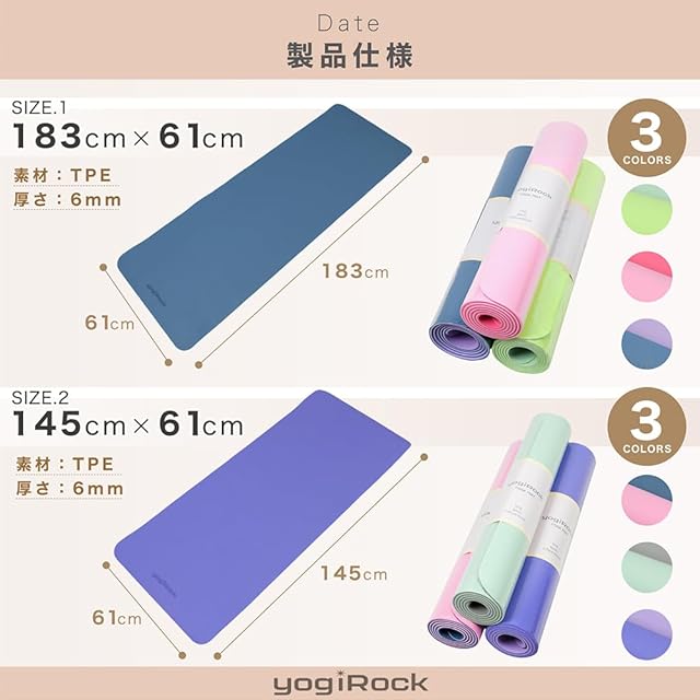ヨガマットサイズ:●(約)長さ145cm×幅61cm×厚み6mm●重量:(約)600g●材質:熱可塑性エラストマー(TPE) 収納袋サイズ:●長さ70cm×幅25cm●セット内容:ヨガマット本体、収納袋