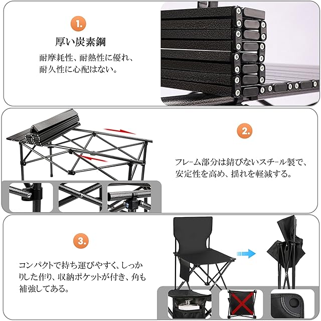 【軽量&コンパクト収納設計】 アウトドア向け折りたたみテーブル&チェアセット(テーブル重量約3.4kg/チェア1.25kg)は、専用収納袋付きでキャンピングカーや車中泊に最適。